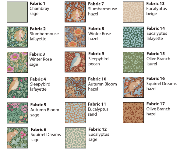 The soft sage background allows the printed leaf fabrics to stand out beautifully while maintaining a harmonious overall palette.