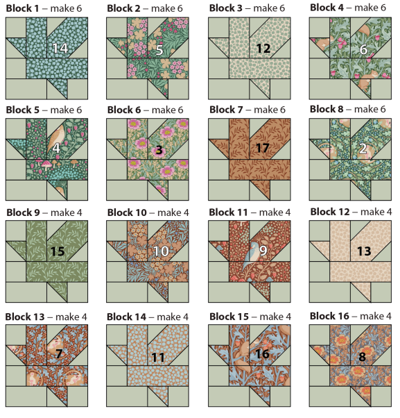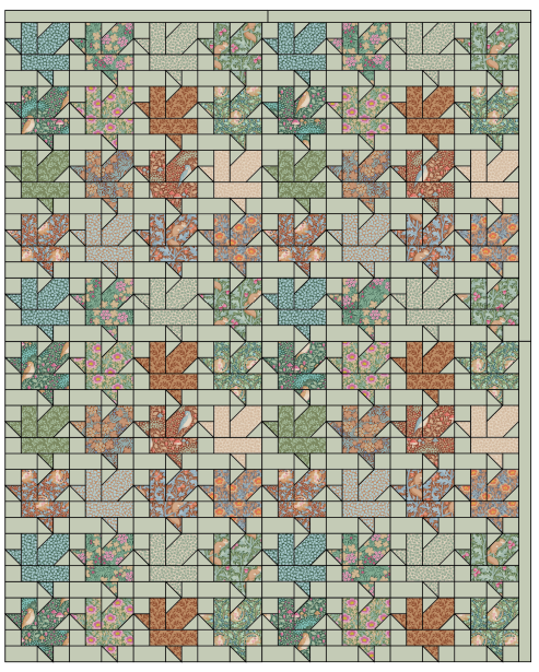 This quilt uses a variety of printed fabrics to create the colorful leaf blocks. The pattern includes seventeen fabrics, including the background fabric and various leaf prints.