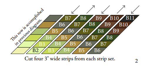 2. Strip Sets – Using fabrics labeled B and C, sew strip sets with precise staggering (2 ¼” shifts), then cut into 3” wide strips. These are pieced into rectangular units.